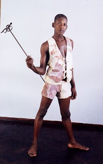 Só prá contrariar, ele se veste de carne prá desnudar a própria carne e expor a violência sofrida nos idos da escravidão passada e atual. É a performance “A Transmutação da Carne”, apresentada no Instituto Cultural Brasil Alemanha (2000). Tudo feito em carne, costurada com barbante.